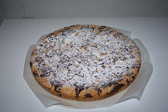 Sfornata la torta, dopo circa 5 minuti mettete sopra il cioccolato fondente tagliato a pezzettini, che andranno a sciogliersi appena.